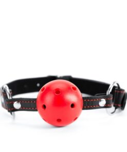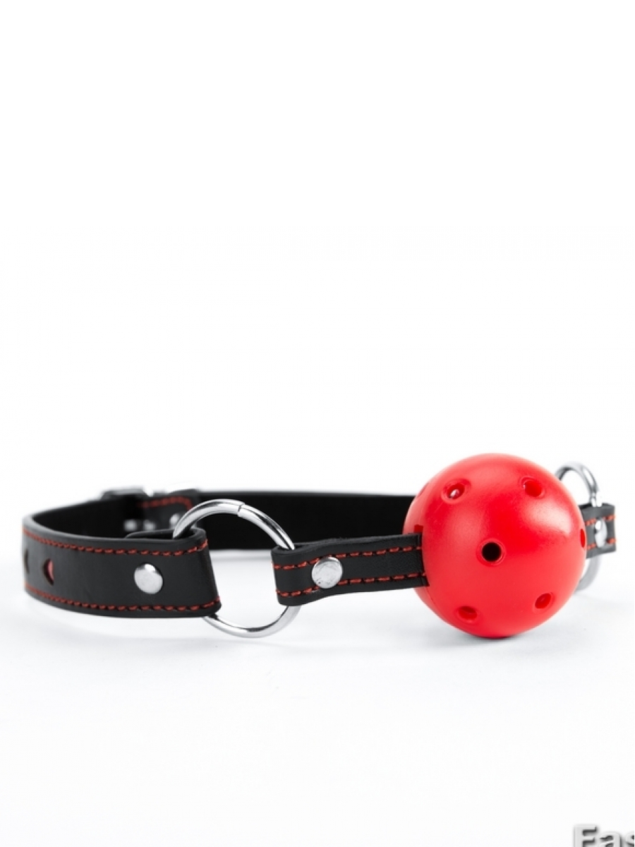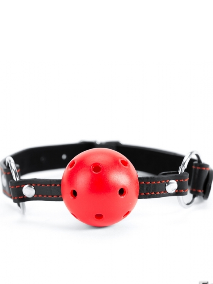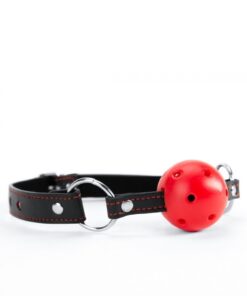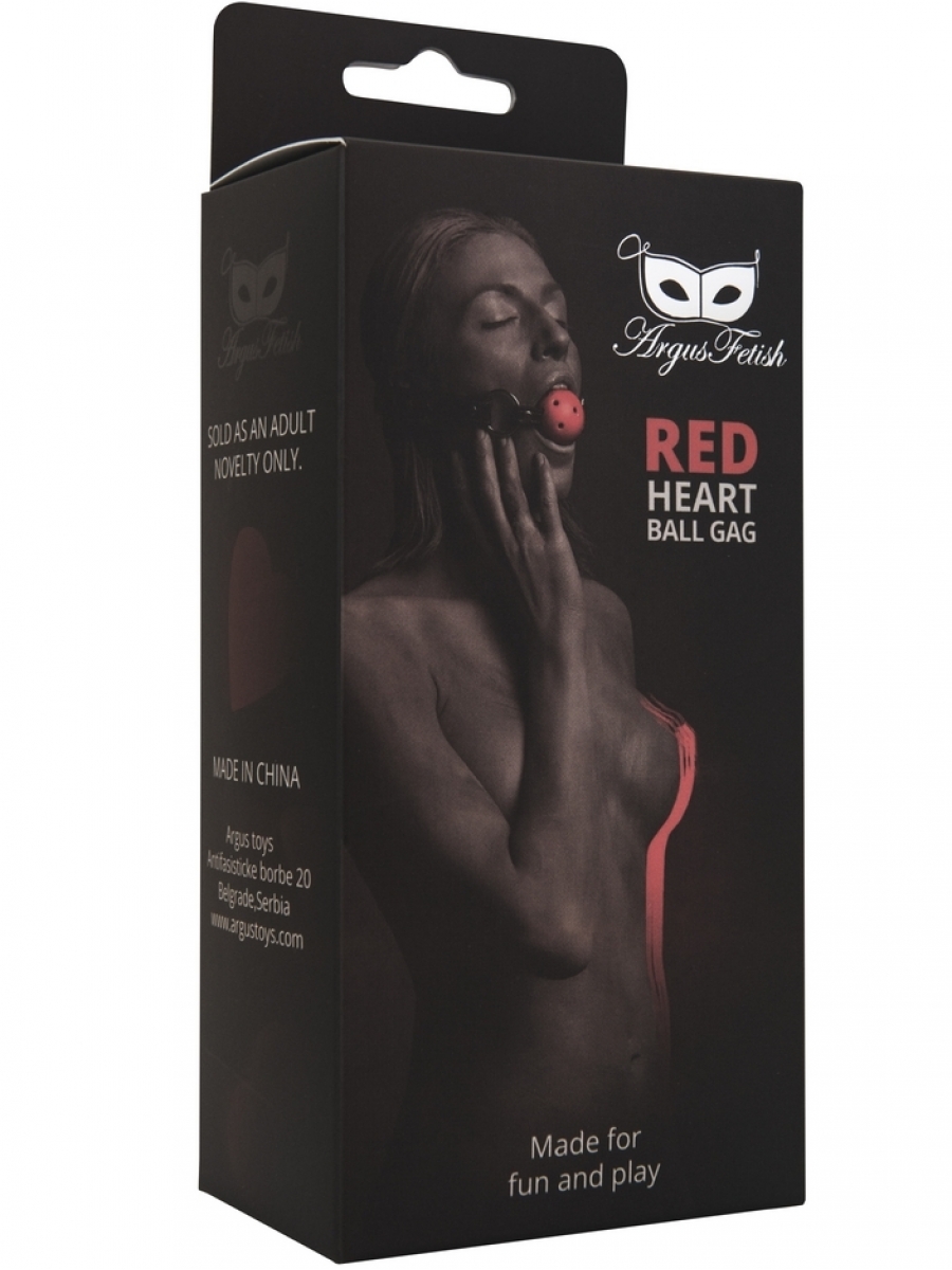 Crvena fetiš kugla za usta,kaiš napravljen od veštačke kože odličnog kvaliteta sa utisnutim crvenim srcima na njemu. Kugla napravljena od plastike sa rupama radi lakšeg disanja, Prečnik kugle je 4cm.